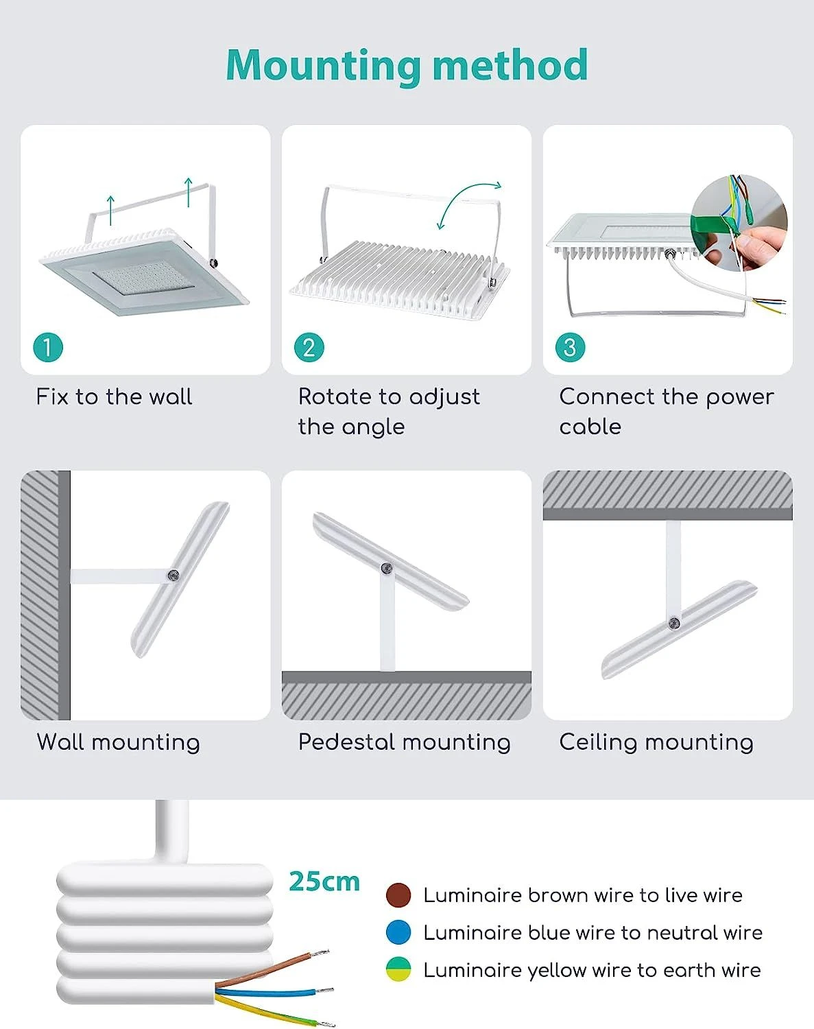 【duradero e impermeable】 floodlight led foco está hecho de una carcasa de aluminio de alta calidad, con alta densidad, sin contracción, resistente al agua y a las caídas, esta lámpara translúcida es liviana, resistente a caídas y fuerte en disipación de calor, con una vida útil de hasta 25,000 horas. Además, cuando no esté en uso, puede desmontar y reciclar.【rotación de 180°del cuerpo de la lámpara y máscara de vidrio templado de alta resistencia】focos para exterior está hecho de vidrio endurecido reforzado de alta transmitancia, con buena transmisión de luz, luz uniforme, impermeable y no es fácil de romper. el soporte de estos reflectores para exteriores se puede ajustar a 180 grados y ajustar el ángulo de irradiación en 180 ° para lograr una iluminación precisa.【clasificación ip 65】 focos pared exterior led a prueba de agua ip65 funcionan bien en entornos de lluvia, aguanieve, nieve para sus jardines, patios, césped, muelles, estadios, áreas de juego abiertas, etc.【ángulo de haz grande de 120 °】 focos exterior proporciona un ángulo de haz grande de 120°con gran iluminancia y una larga distancia de iluminación que puede funcionar normalmente independientemente de la lluvia, la nieve, el calor o el frío. Además, las perlas de la lámpara de alto brillo tienen una eficiencia luminosa duradera, salida estable, baja disminución de la luz, alto índice de reproducción cromática que puede ayudarlo a ahorrar energía y energía.【fácil instalación】focos para exterior son fáciles de instalar con 3 pasos, solo necesita 1. Seleccionar la posición de instalación y perforar los orificios; 2. Conecte los cables eléctricos por colores; 3. Apriete los tornillos y asegúrese de que esté fijo. Se puede instalar de forma sencilla y flexible en el techo, las paredes, el suelo y otros lugares.