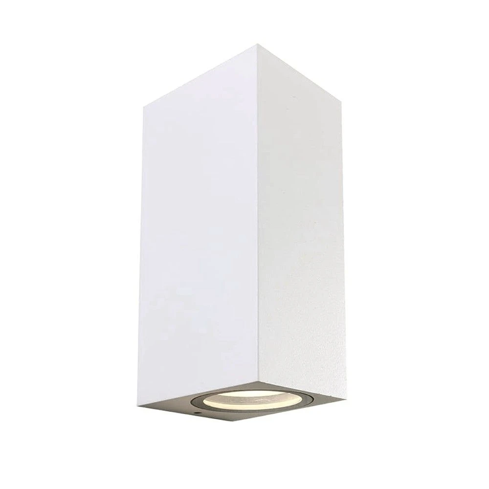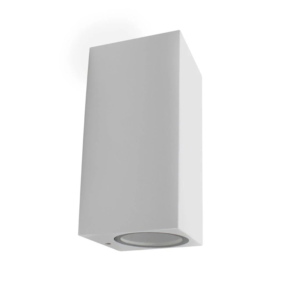 Aplique de pared con punto de luz arriba y abajo classic. Diseño rectangular de color blanco mate, ideal para instalar en paredes de exterior en urbanizaciones y garajes. Puedes instalar un aplique en la pared a cada lado de la puerta de entrada o instalar varios en línea iluminando una zona de paso.