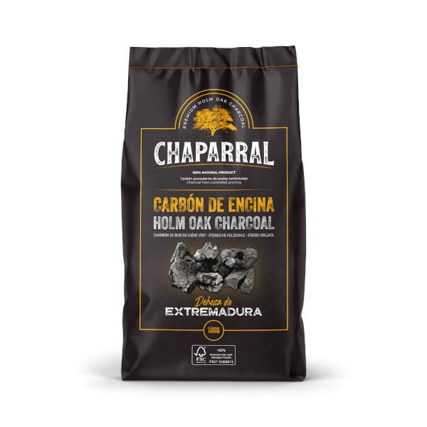 Carbón de encinas Chaparral.Formato: bolsa 10 KgPoder calorífico: 6500 kcal/KgMedidas: piezas entre 60 y 200 mmMaterial: madera procedente de podas controladas de encinas en Dehesa de Extremadura.Uso: especial barbacoas, con larga duración de brasa; aprox. 150 min de tiempo útil de asado. Para todo tipo de carnes y verduras.La biomasa es una fuente de energía renovable asequible, segura y eficiente, con menos emisiones de CO2 por su forma de combustión. Su composición ayuda al mantenimiento de los bosques y al reciclaje de residuos agrícolas. No contaminante….
