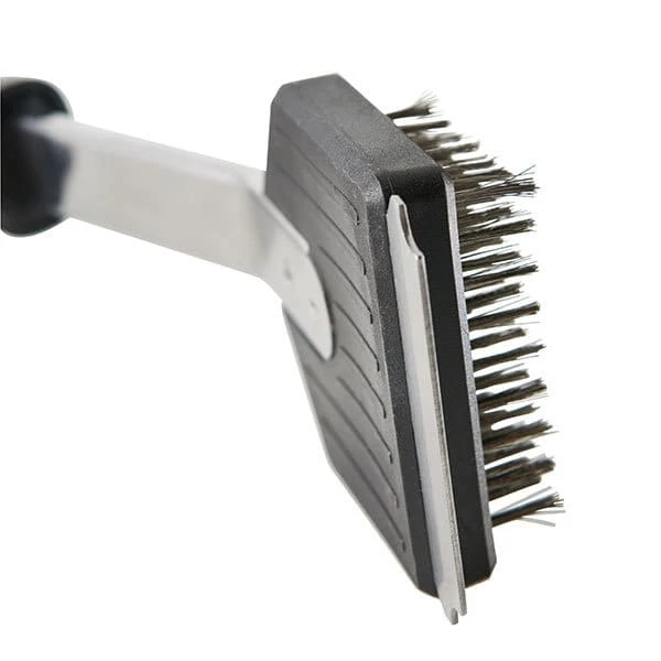 Cepillo de limpieza para parrilla 2 en 1 que incluye rasqueta y cepillo.Este accesorio de limpieza te ayuda a mantener la parrilla limpia y ordenada con un cepillo en un lado y un rascador en el otro. Se ha diseñado con un mango ergonómico de agarre cómodo y un cabezal de acero inoxidable. El práctico anillo del mango permite colocar el cepillo en el borde de un cubo, de forma que el mango permanezca seco mientras el cepillo está en la solución de lavado.Medidas: Anchura 8,5 x longitud 37,6 cm.