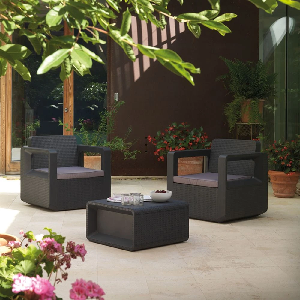 Set venus tête à tête de color grafito con diseño innovador y moderno. Mobiliario de resina con trenzado similar al ratán. Conjunto de terraza formado por dos sillones y una mesa baja de centro. Además, este set incluye cómodos cojines. Montaje rápido y sencillo, limpieza fácil. Fabricado en españa con materiales reciclados.